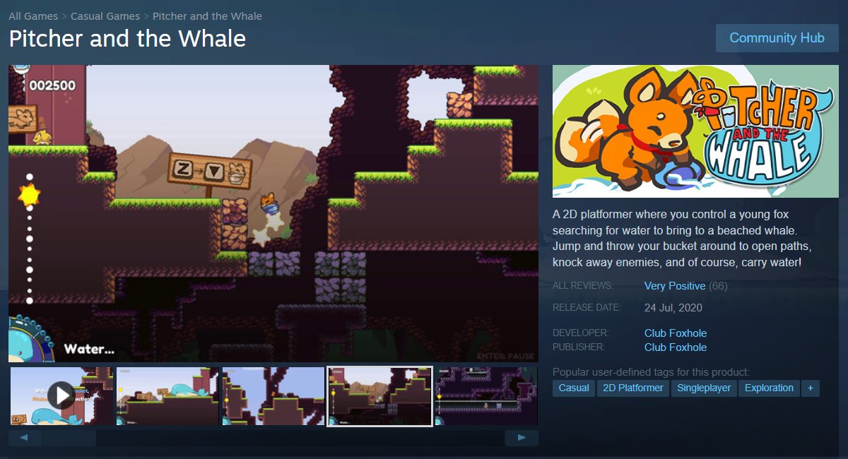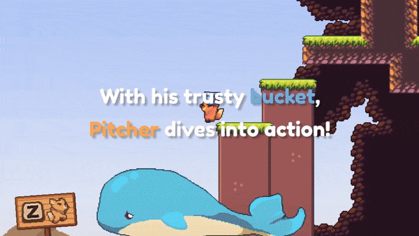 A 2D platforming game featuring a fox exploring a mountain and bringing water to a beached whale with his trusty bucket.