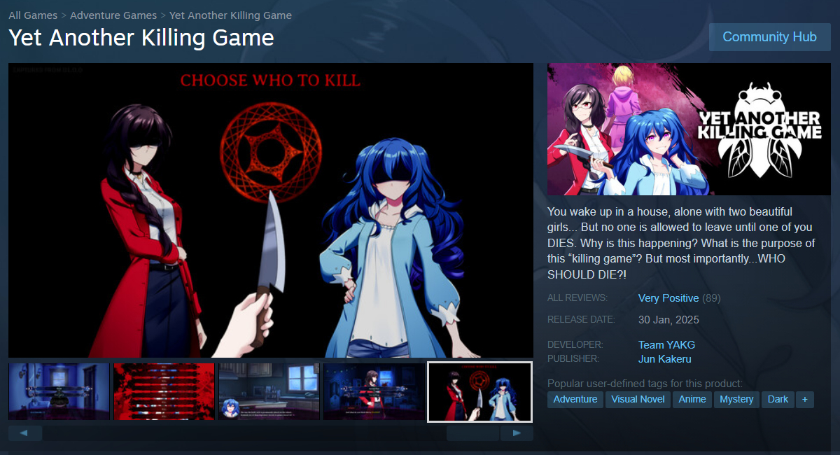 A mystery thriller adventure game where the protagonist is trapped with two others, and the player's choices determine who will die for the rest to escape.